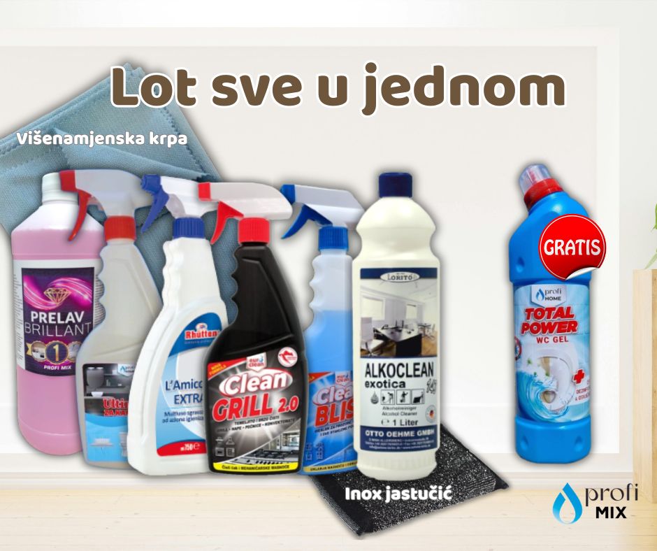 Lot sve u jedan je savršen komplet za svako domaćinstvo jer sadrži pažljivo odabrane proizvode koji olakšavaju čišćenje i održavanje higijene u svim prostorijama. Umjesto da kupujete svako sredstvo posebno, ovdje dobijate sve što vam je potrebno na jednom mjestu – praktično, povoljno i efikasno.